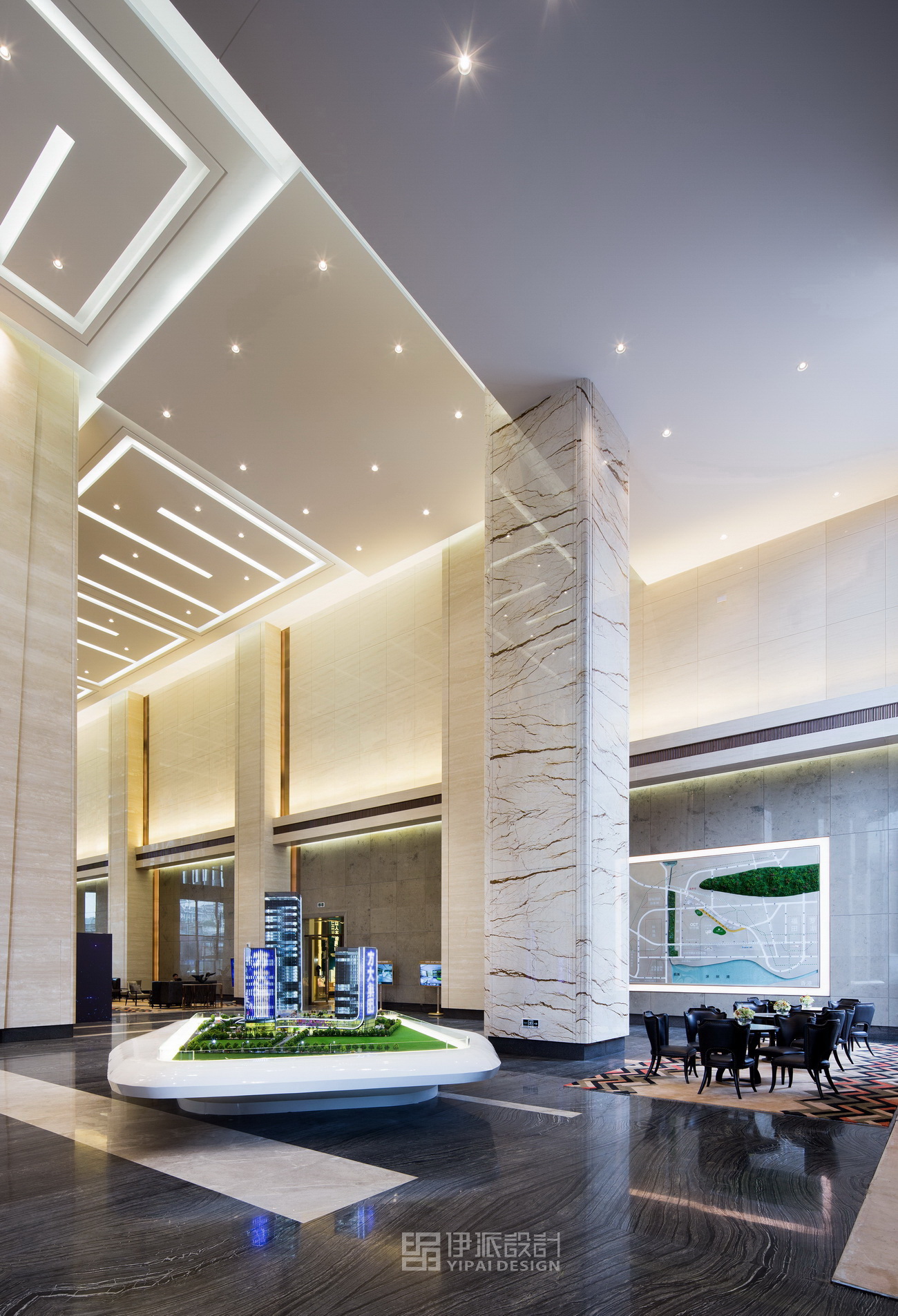 南山華僑城片區(qū)的方大城樓盤,規(guī)劃面積44000平方米,售樓處面積2500平方米,定位于標(biāo)準(zhǔn)寫字樓,因此,售樓處設(shè)計(jì)手法皆是以呈現(xiàn)現(xiàn)代高效辦公大樓視覺效果為主。在層高優(yōu)勢(shì)的基礎(chǔ)上,通過空間韻律與層次,賦予空間更為現(xiàn)代化、高效化的視覺、辦公體驗(yàn)感。